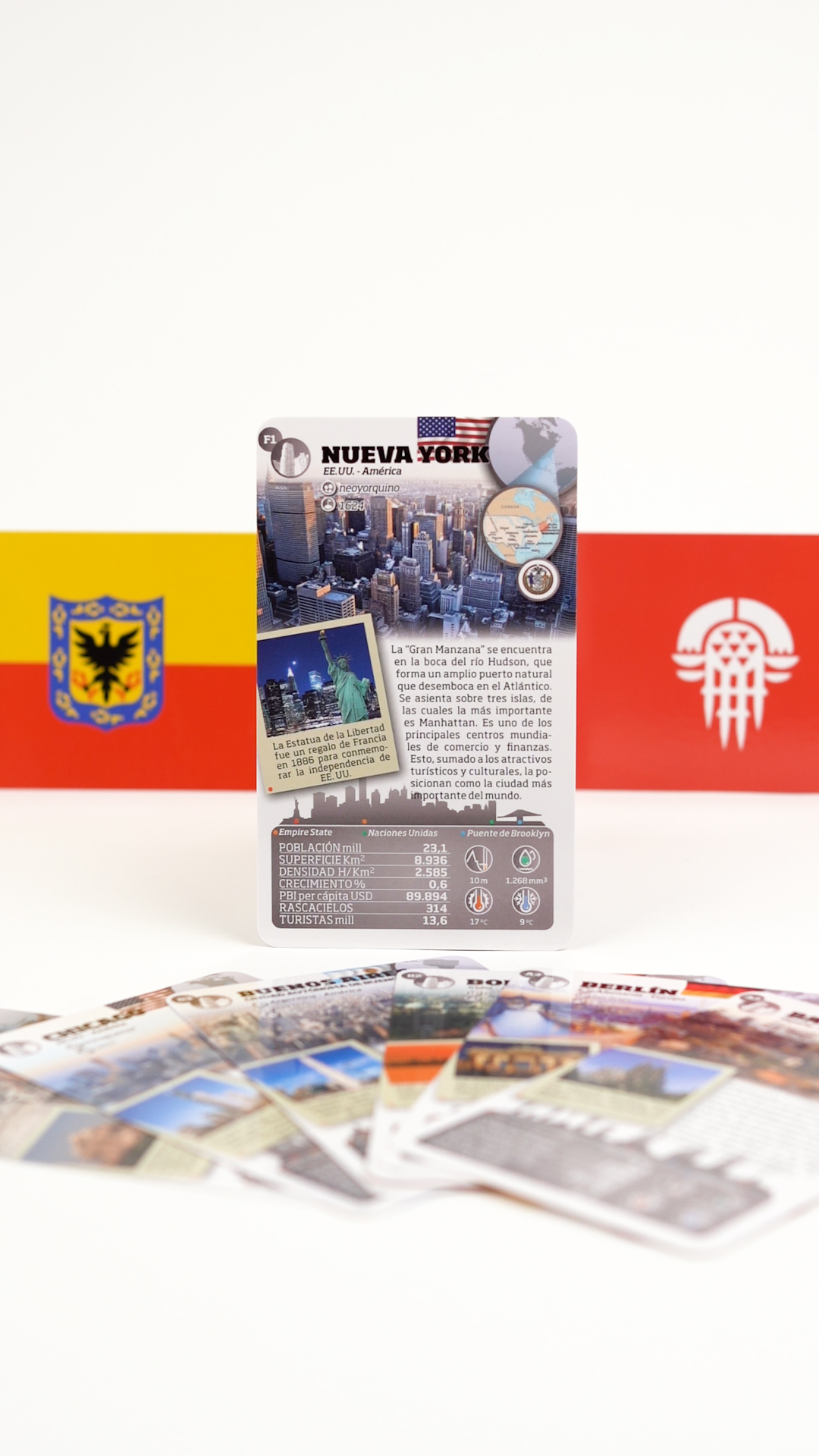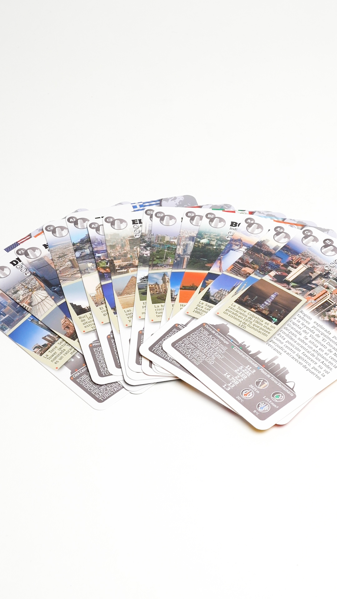 En cada ficha encontrarás: su ubicación geográfica, una vista aérea, su principal atractivo turístico, el skyline con sus principales edificios, su clima y sus características categorizadas para que puedas compararlas y jugar con ellas.