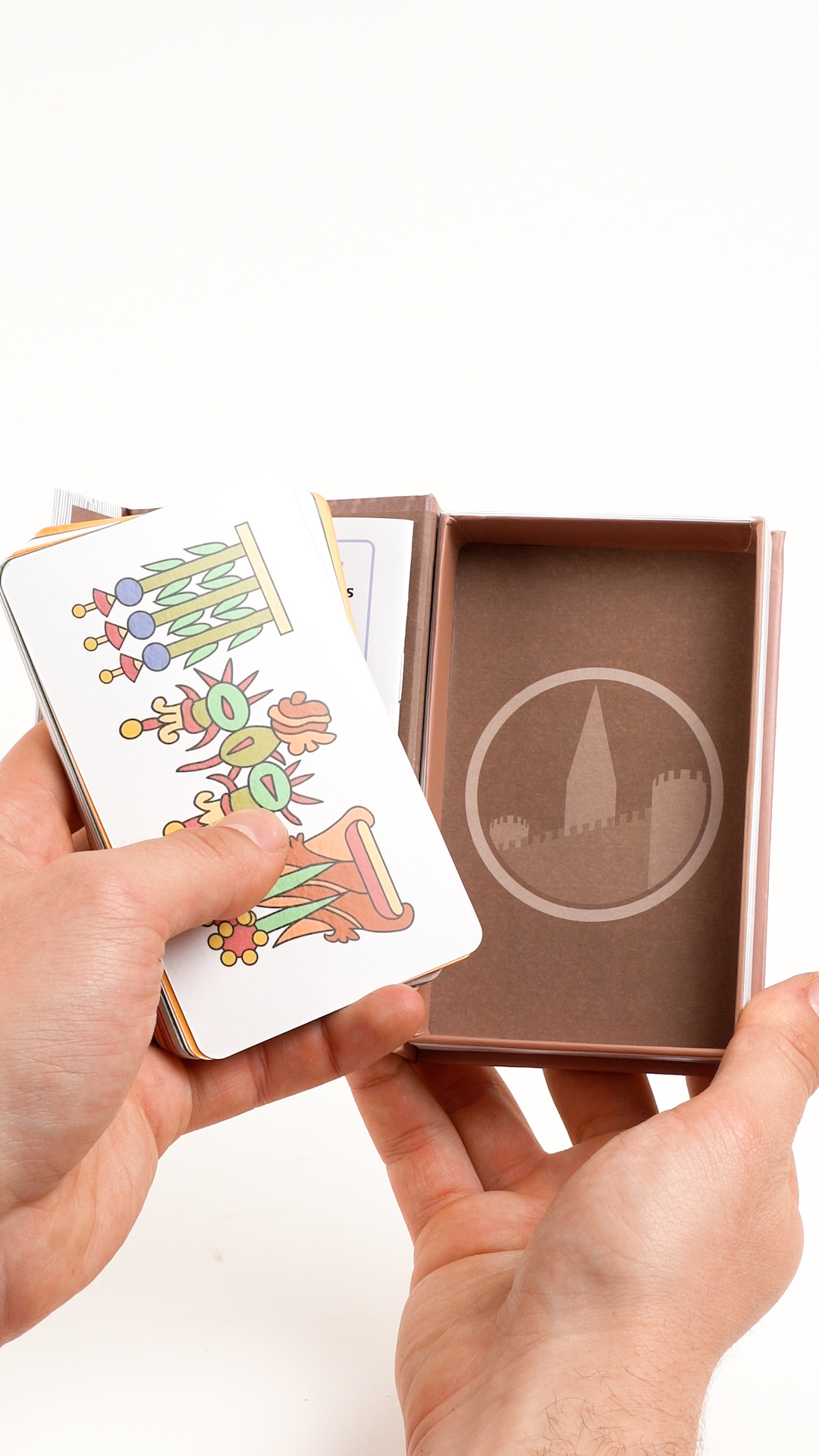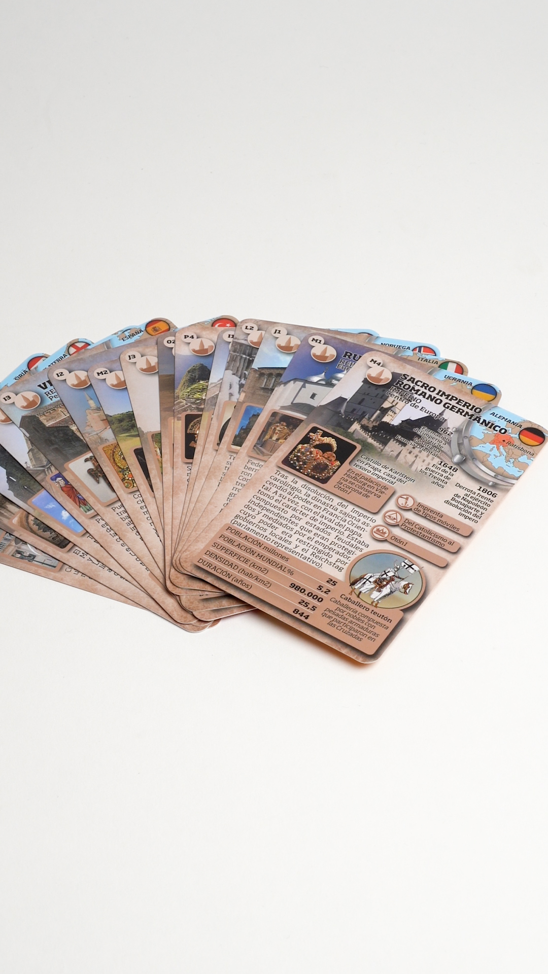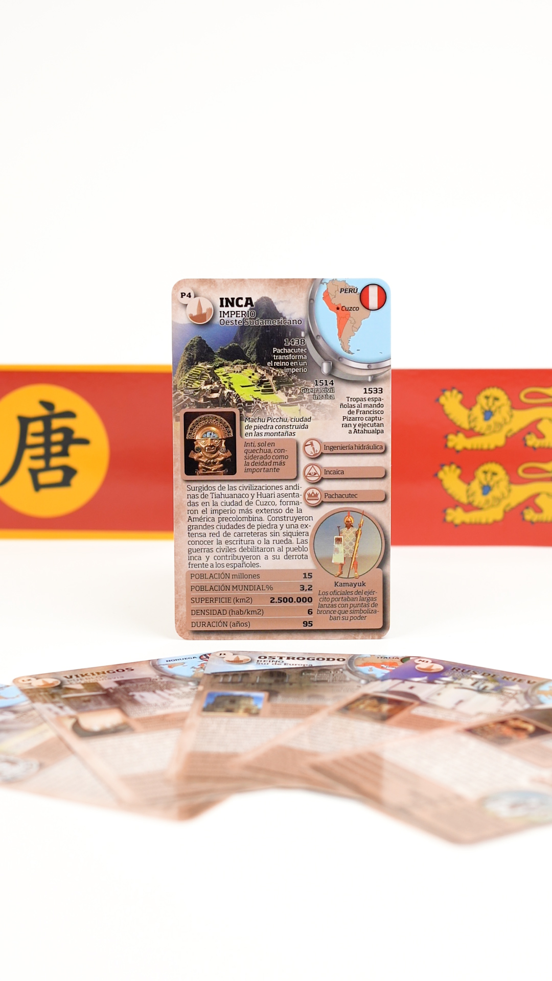 En cada ficha encontrarás: Un mapa de su máxima extensión, los hitos más importantes de su desarrollo, ejemplos de su arquitectura y legado artístico, religión, innovaciones tecnológicas, unidades elite de batalla y sus características categorizadas para que puedas compararlas y jugar con ellas. En el dorso su bandera.