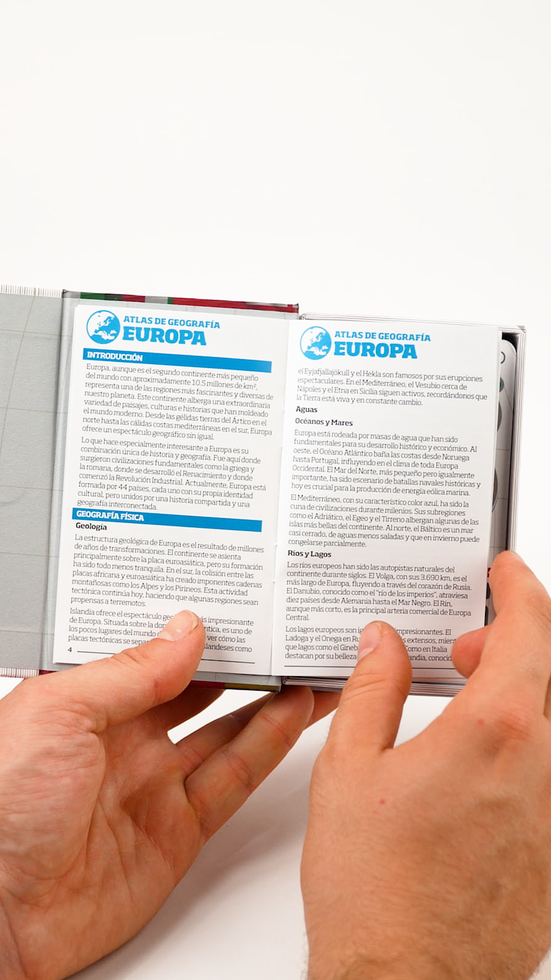 Atlas mundial diseñado para aprender jugando. Contiene fichas infográficas doble faz, presentadas a modo de páginas sueltas en la obra, ideales para ser utilizadas de forma interactiva. Su información categorizada facilita la comprensión mediante la lectura, la comparación y la deducción.