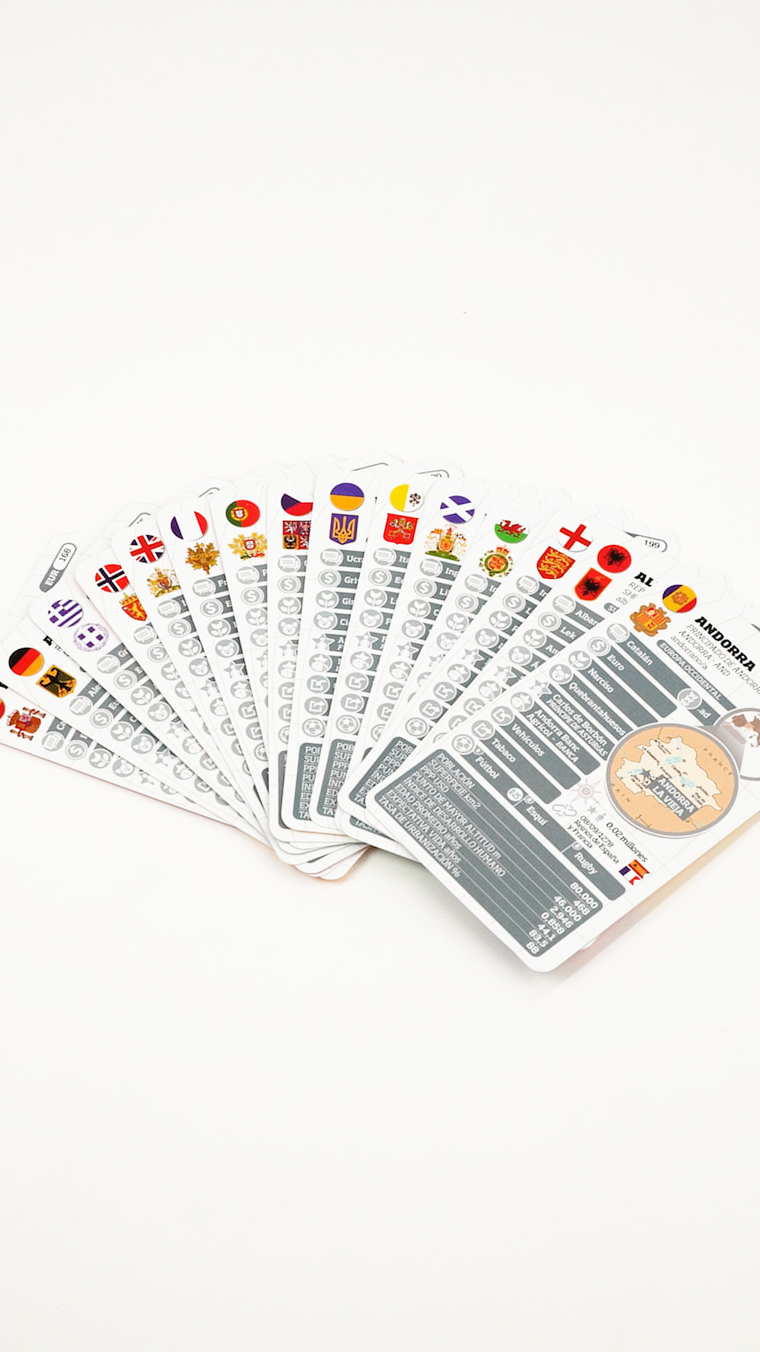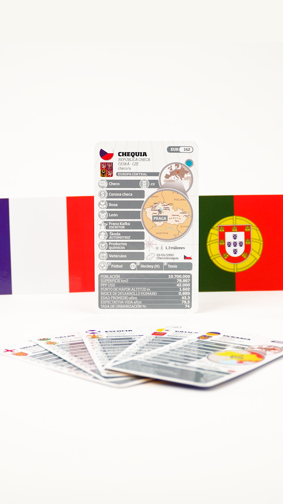 En cada ficha encontraras… más de 40 puntos de información por país con indicadores económicos, culturales y demográficos, que te permitirán deducir la realidad de cada nación en base a la comparación de estos datos. Y en el dorso su bandera para que puedas reconocerlos.