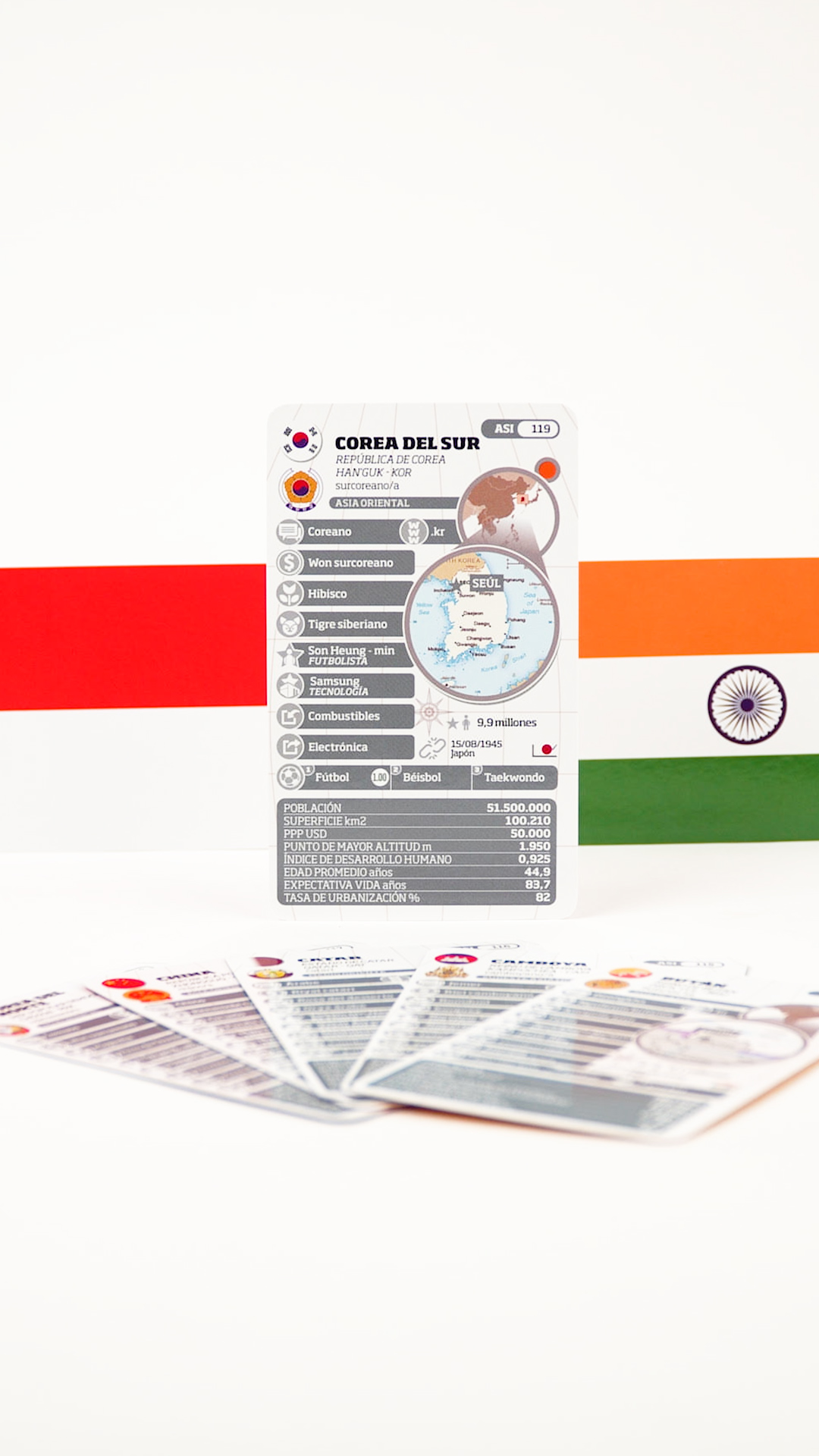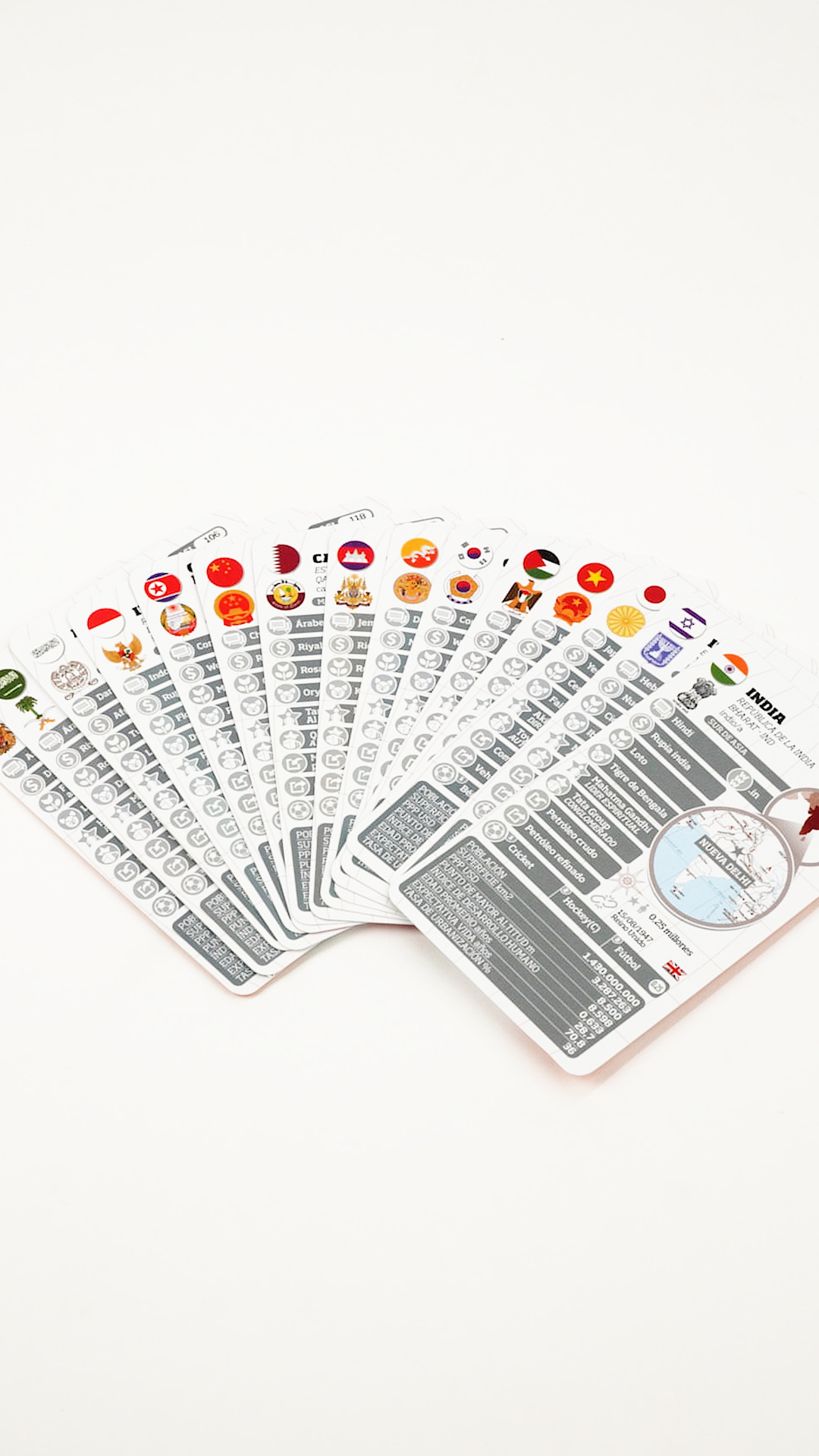 En cada ficha encontraras… más de 40 puntos de información por país con indicadores económicos, culturales y demográficos, que te permitirán deducir la realidad de cada nación en base a la comparación de estos datos. Y en el dorso su bandera para que puedas reconocerlos.