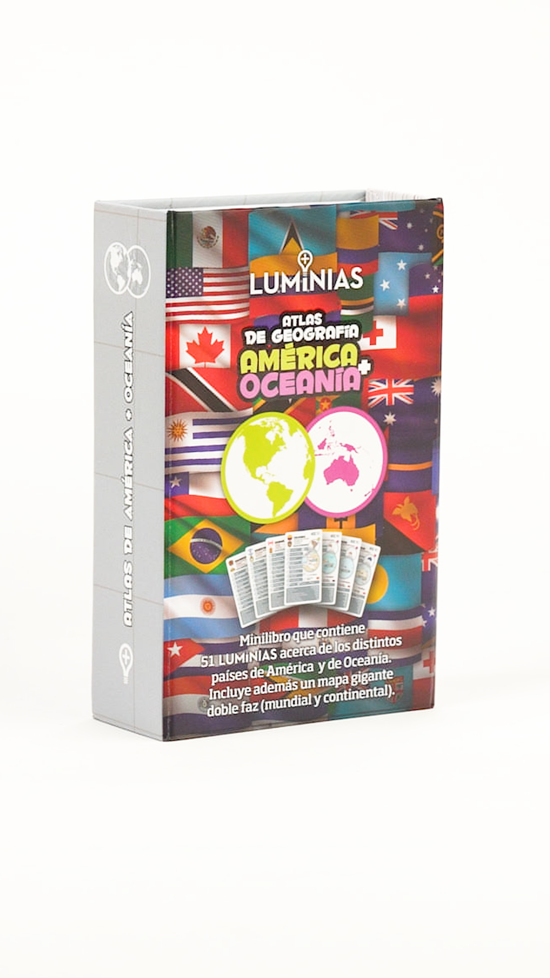 Atlas mundial diseñado para aprender jugando. Contiene ¬fichas infográficas doble faz, presentadas a modo de páginas sueltas en la obra, ideales para ser utilizadas de forma interactiva. Su información categorizada facilita la comprensión mediante la lectura, la comparación y la deducción.
