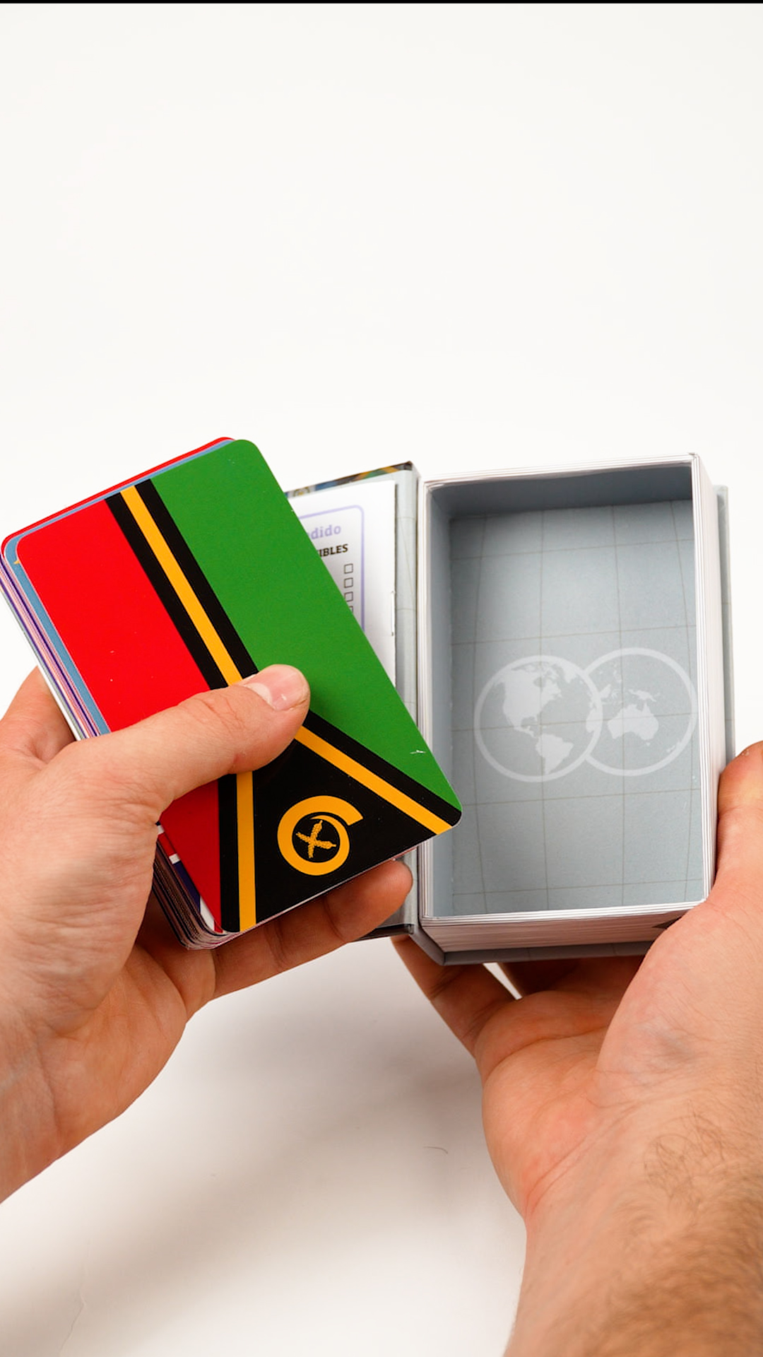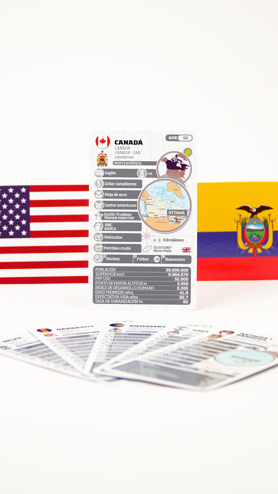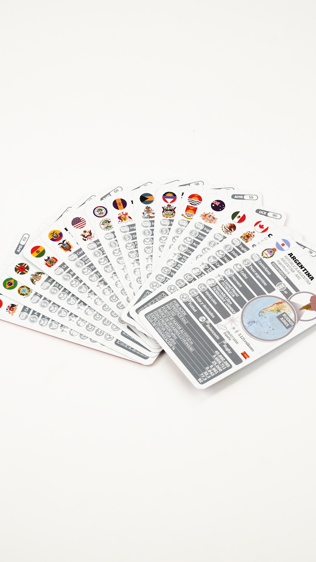 En cada ficha encontraras… más de 40 puntos de información por país con indicadores económicos, culturales y demográficos, que te permitirán deducir la realidad de cada nación en base a la comparación de estos datos. Y en el dorso su bandera para que puedas reconocerlos.