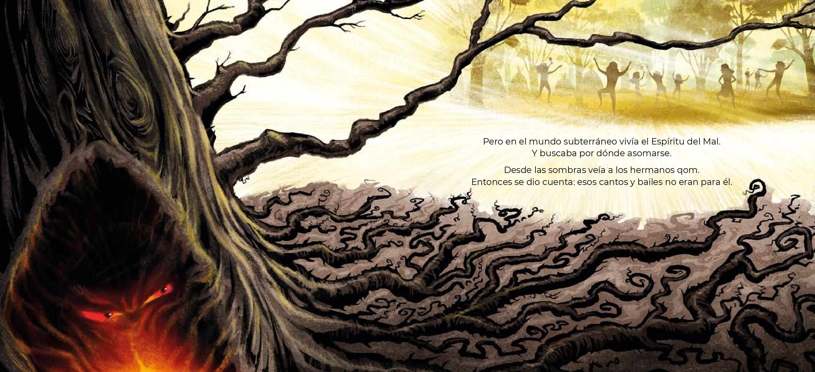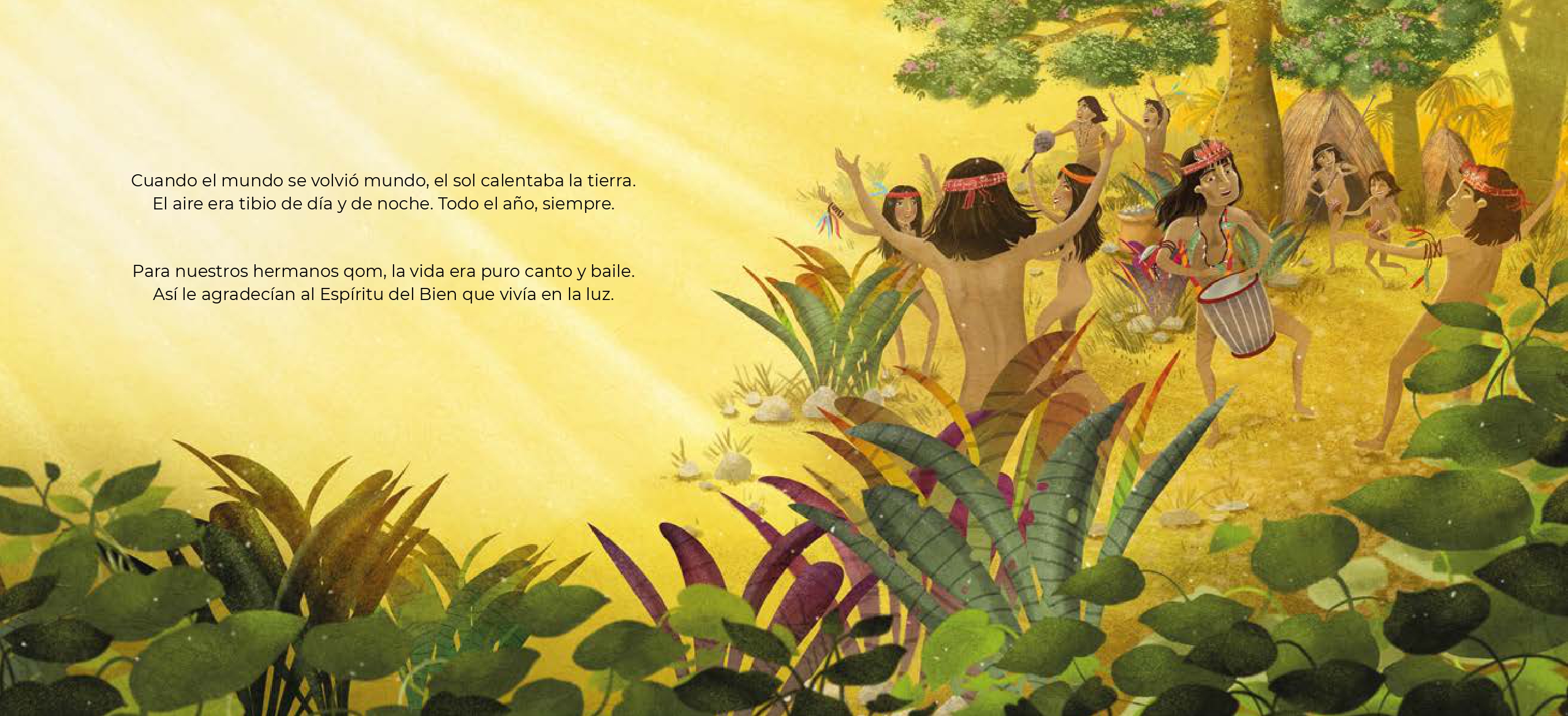 Cuenta la leyenda que cuando el pueblo qom llegó a orillas del río Bermejo, siempre era verano. Los qom eran felices: bailaban y agradecían siempre al Espíritu del Bien. Para el Espíritu del Mal, en cambio, no había canto ni baile. Y ese fue justamente el problema. El Espíritu del Mal planeó venganza. Algo que nadie, ni el poderoso Espíritu del Bien, podía deshacer. Un problema terrible para una leyenda tan hermosa que dan ganas de contarla otra vez y otra vez yotra vez.